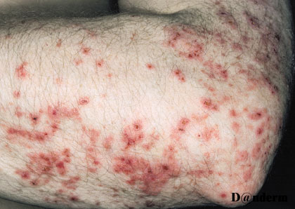 - Intenst kløende papulovesikuløs hudsygdom lokaliseret hovedsageligt på strækkesider af albuer og knæ (symmetrisk), glutealt, nakke og hårbund