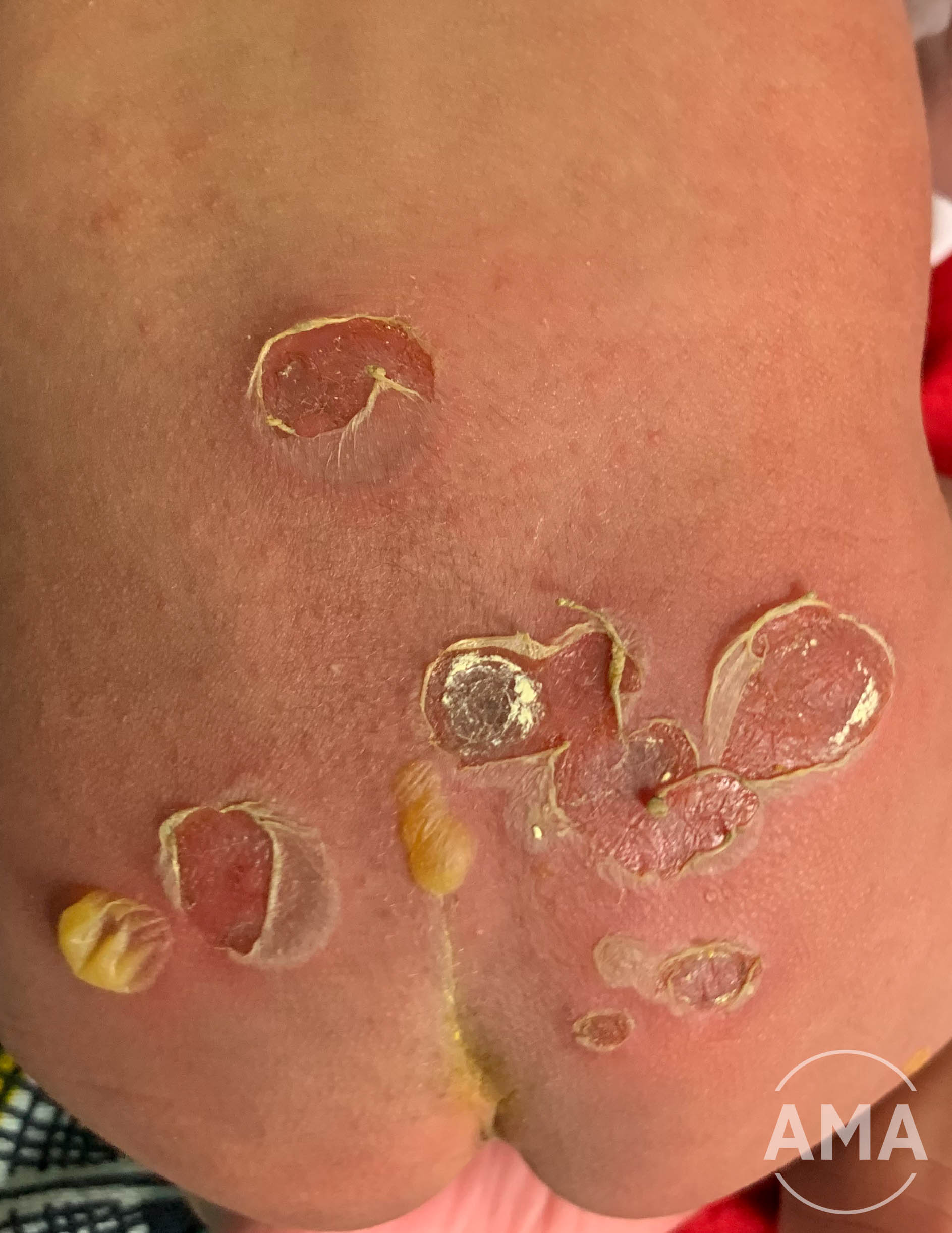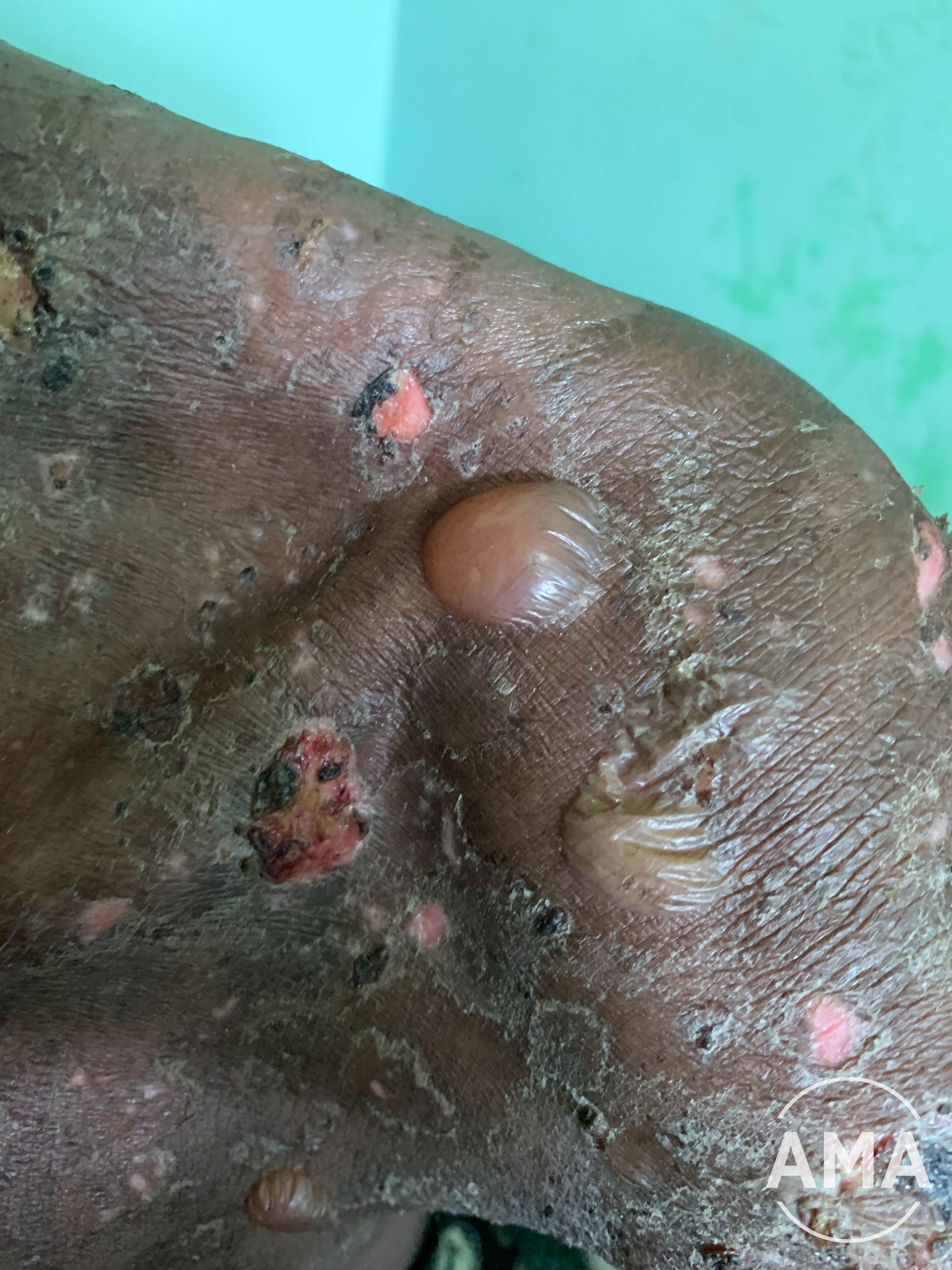 Bulløs pemfigoid hos person med mørkere hud. Kilde til foto