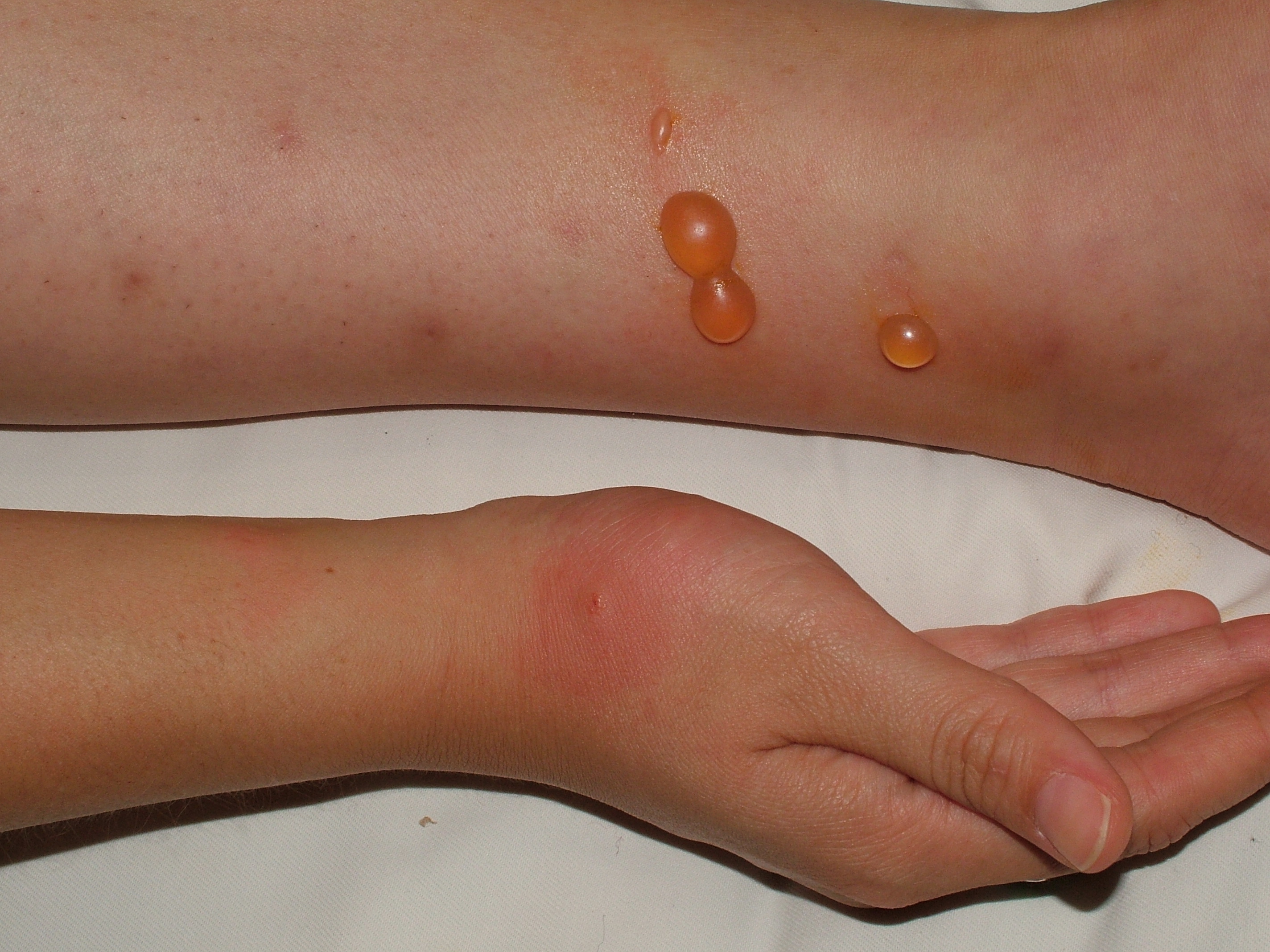 Mennesker reagerer forskelligt på insektstik. Foto viser reaktion med bulladannelse.