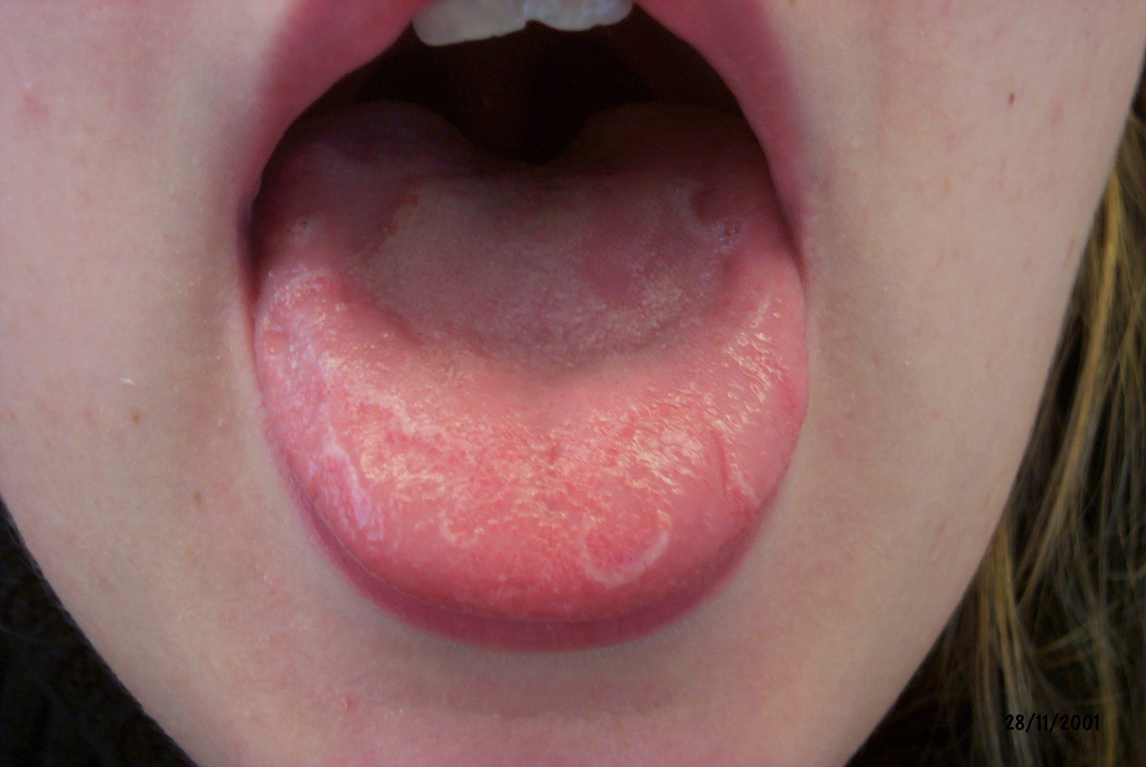 - På tungen ses centralt erythem og atrofi af de filiforme papiller, omgivet af let eleverede, buede, hvidgule kanter