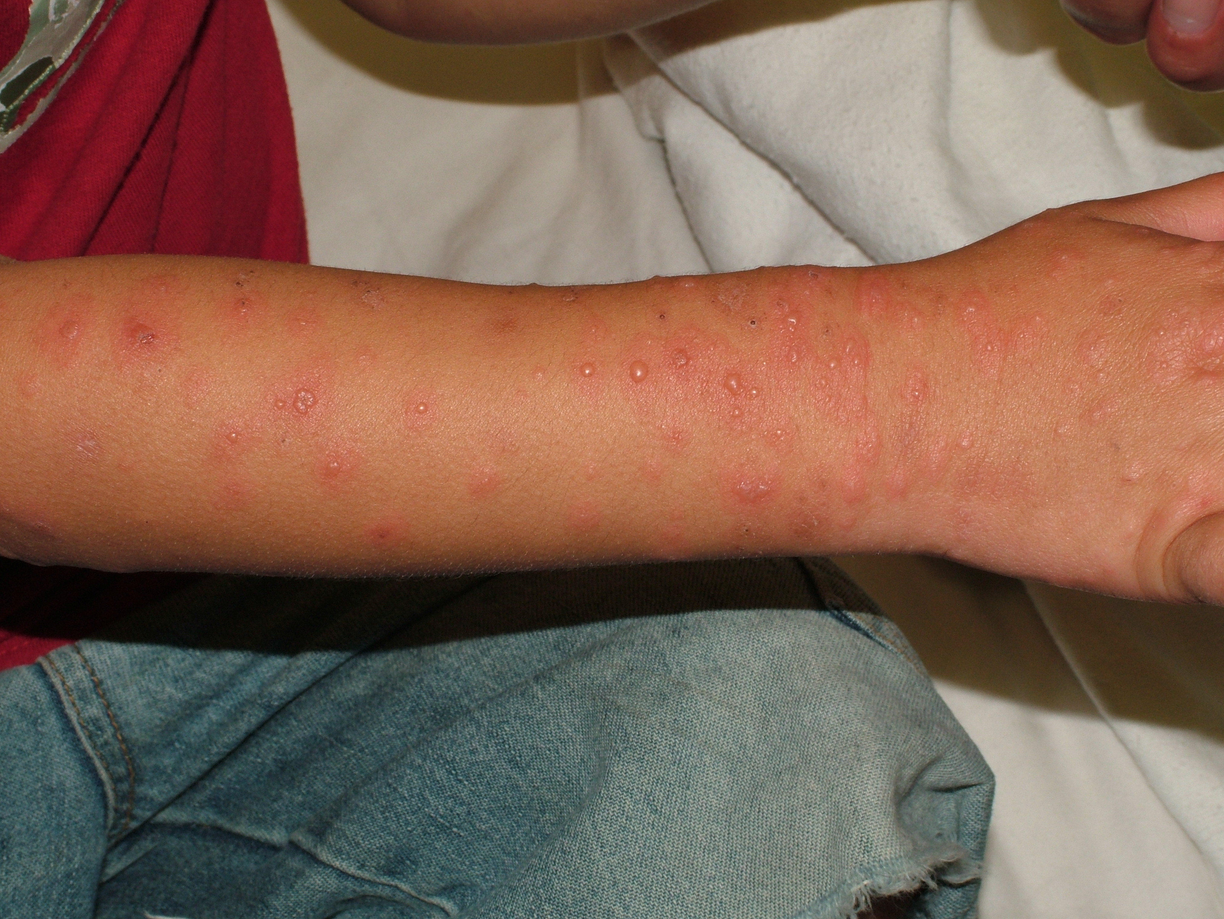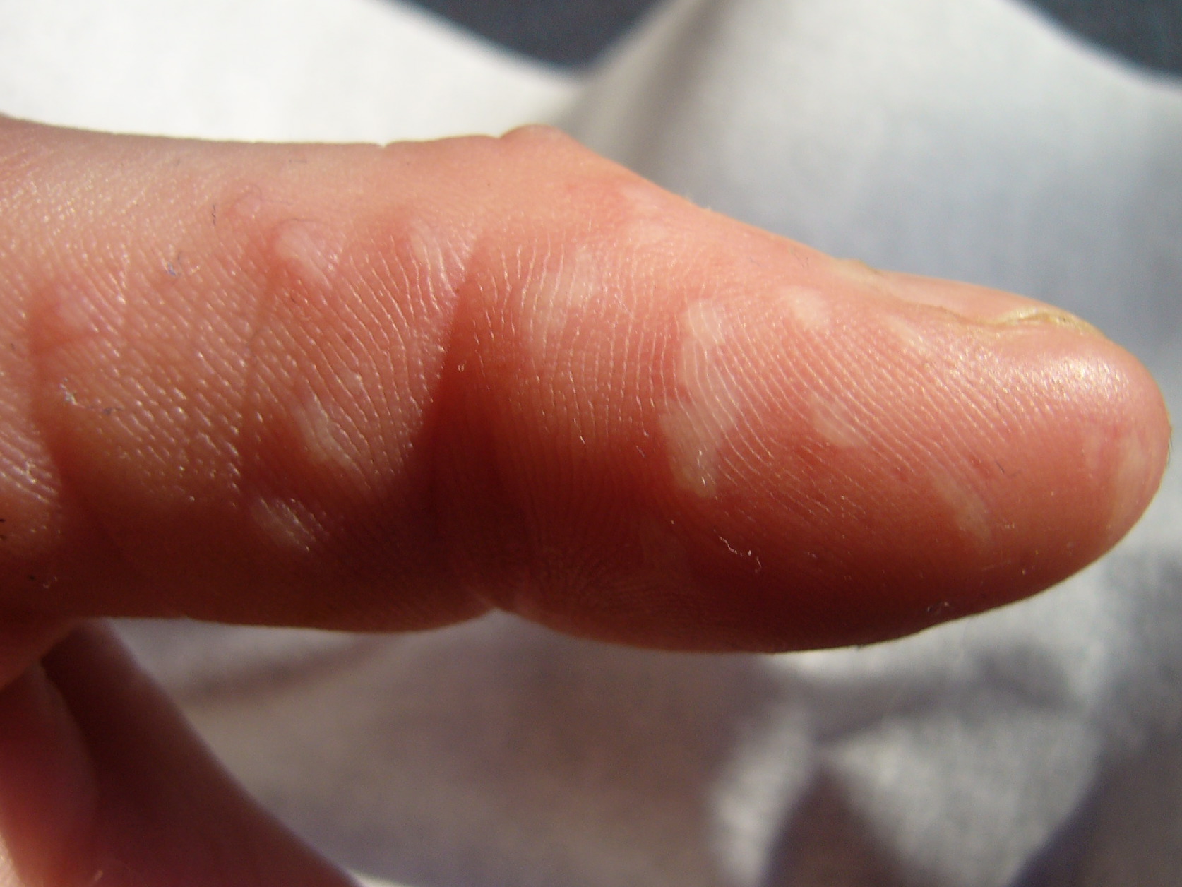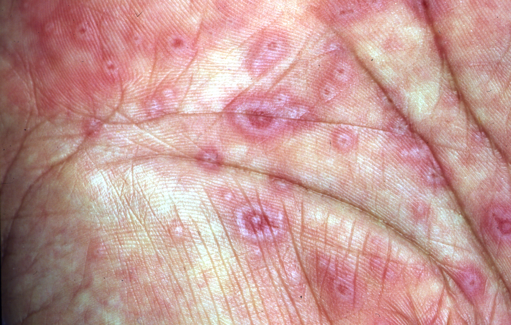 - Små (<5 mm) grå vesikler på hænder og fødder, omgivet af smal, rød halo