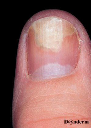 - Læsionen optræder på samme sted i neglepladen i de fleste eller alle af patientens negle