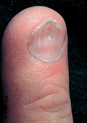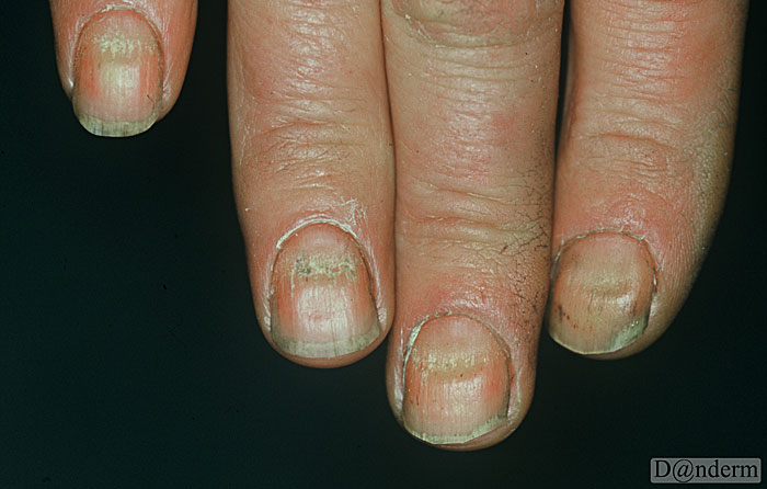 - Kan skyldes periunguale vorter, onychomycosis, eller traumer. Ses ved psoriasis