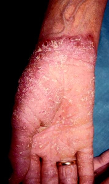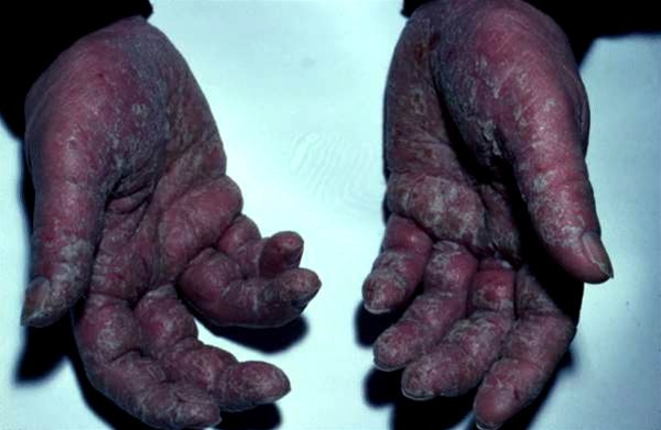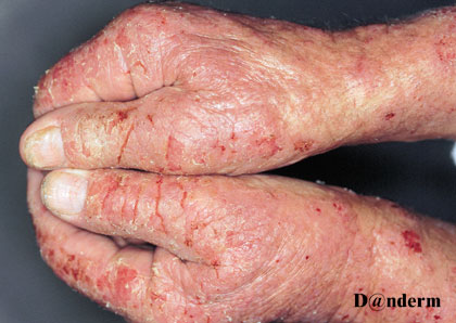 Psoriasis kan være lokaliseret alene i håndflader og fodsåler og kan ligne eksem.