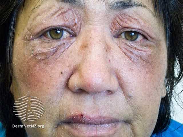 Lægemiddeludløst lysudslæt med hyperpigmenteret, eksematøs hud på øjenlåg og læber Foto venligst udlånt af DermNet