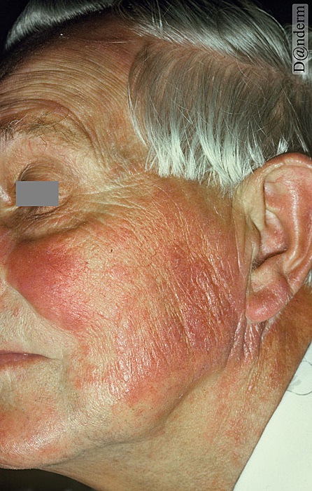 Fotodermatit på kinderne pga behandling med thiazid diuretika. Foto venligst udlånt af Danderm