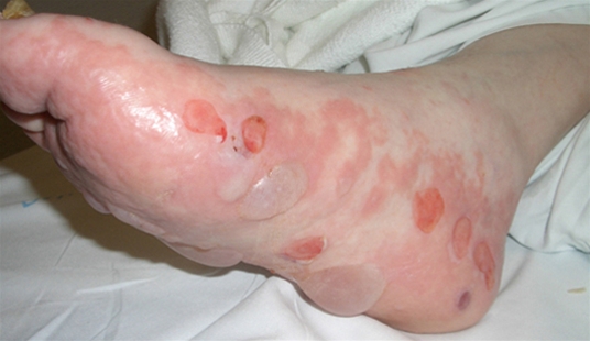 Foto af Bulløs pemfigoid på fod med spændte, gule bullae og inflammation af huden og områder med eroderede bullae
