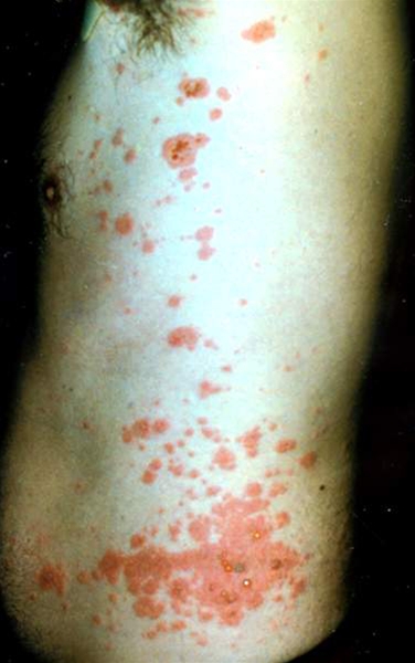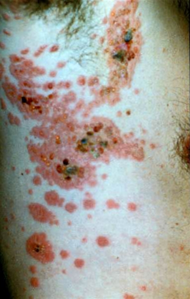 Hudaffektion forekommer også hos 30-50 % af patienterne, oftest i hoved-hals-regionen og øverst på trunkus