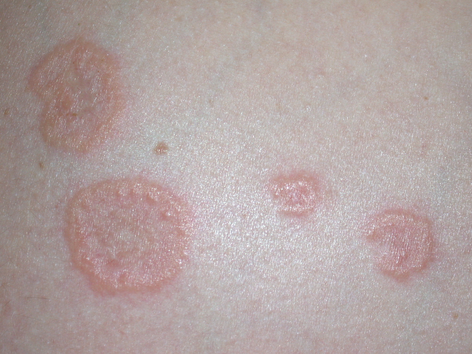 Starter som regel som kløende urticaria-lignende udslæt på abdomen. Kan også starte på ekstremiteter