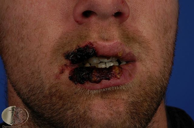 Foto af Stevens-Johnsons syndrom med affektion af mundslimhindeFoto venligst udlånt af DermNet