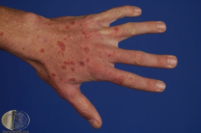 Foto af erythema multiforme på håndryggeFoto venligst udlånt af DermNet