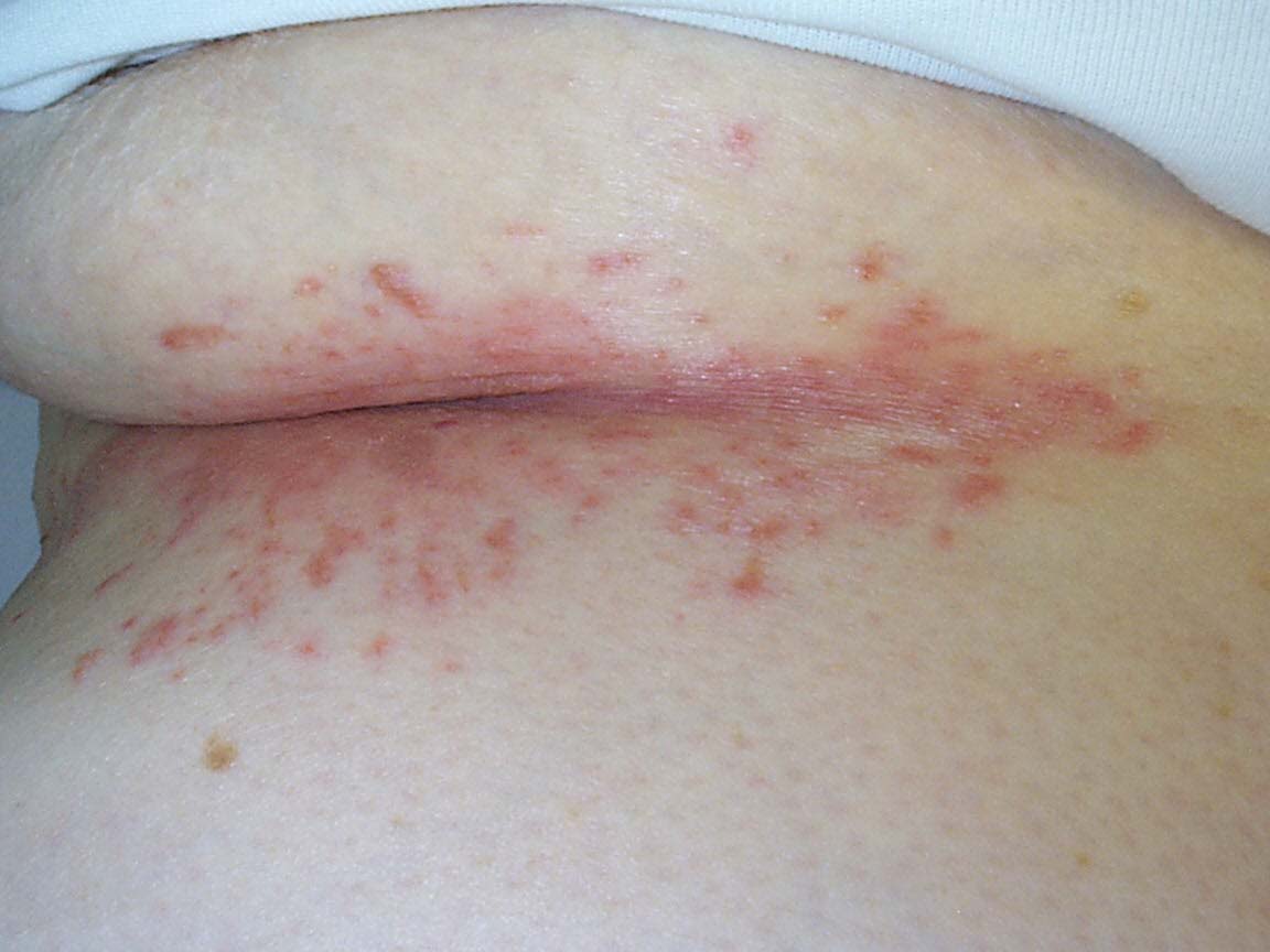 Intertrigo med udtalt inflammation tyder på sekundærinfektion. Candida ses typisk som satellitpapler eller -pustler.