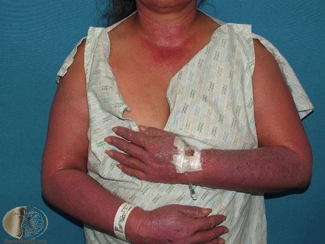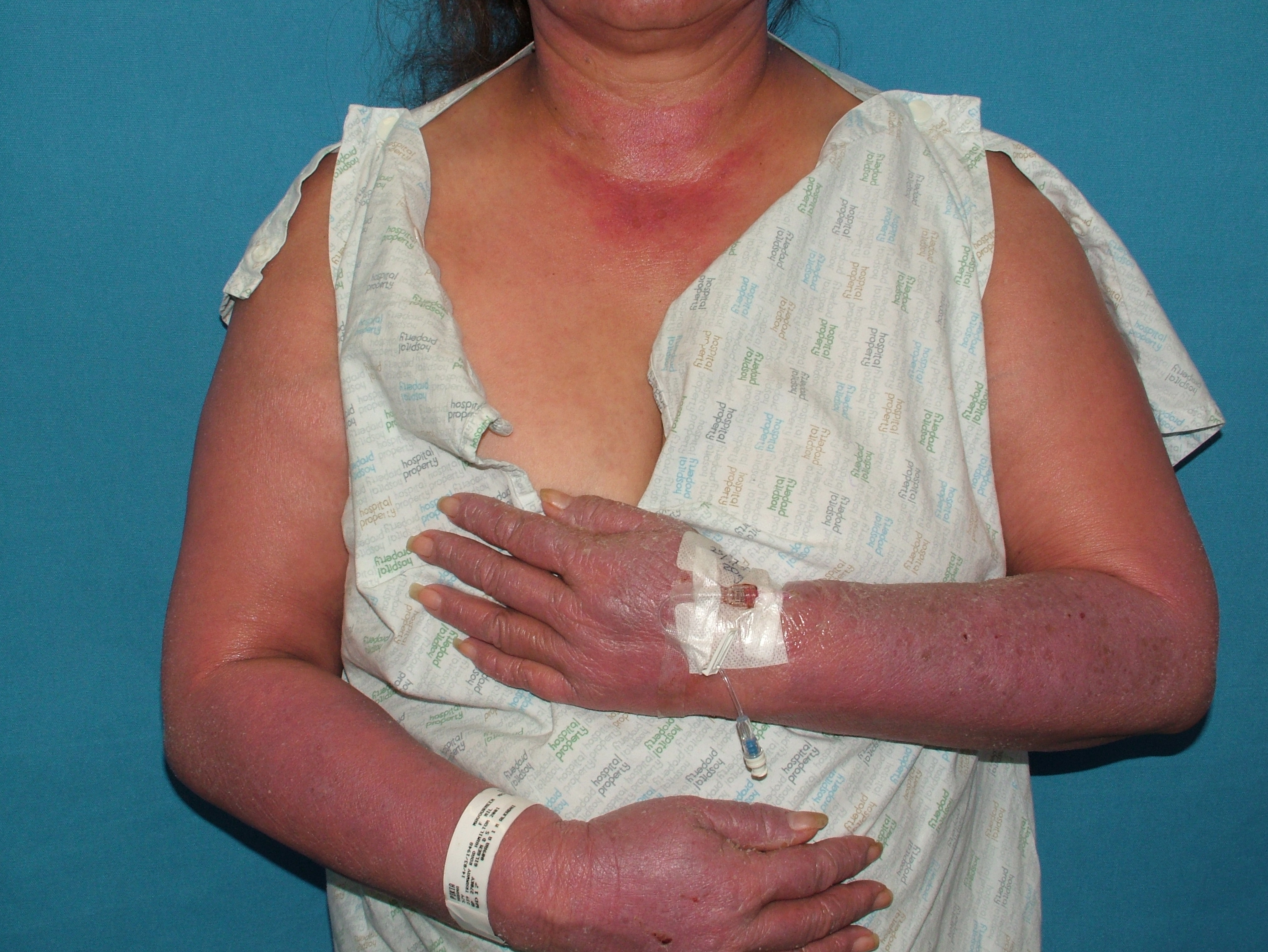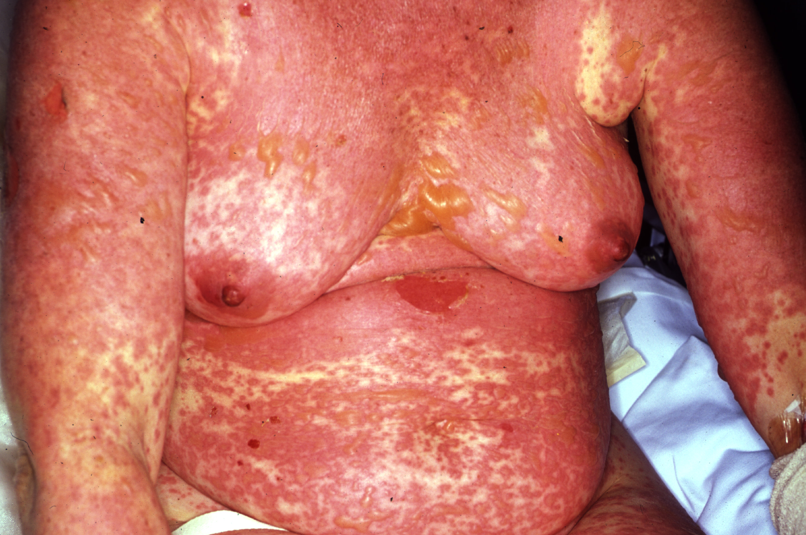 Efter få dage med let sygdomsfølelse udvikler patienten udbredt ødematøst erytem og store slappe bullae med afstødning af nekrotisk epidermis og slimhinde