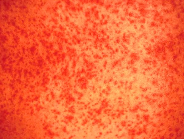 Symmetrisk fordelt makulopapuløst udslæt som kan være til stede overalt på kroppen