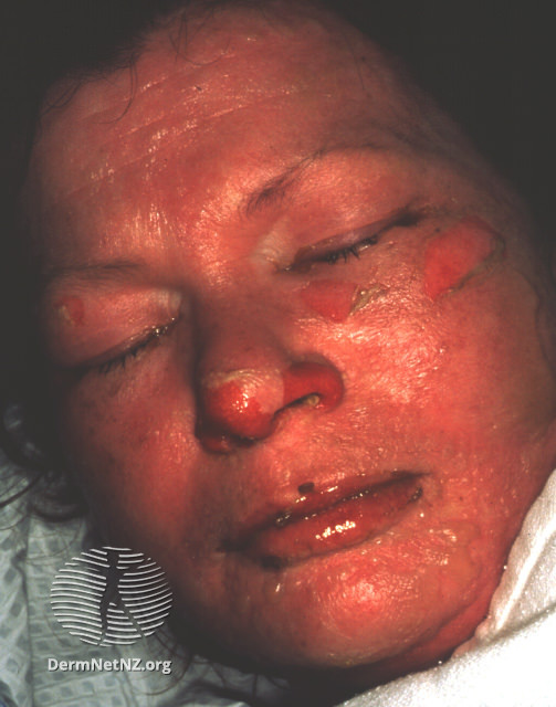 Tilstanden minder om udbredt 2. gradsforbrænding. I gennemsnit afficeres 50 % af huden, mens 100 % tab af epidermis kan forekomme i løbet af 24 timer