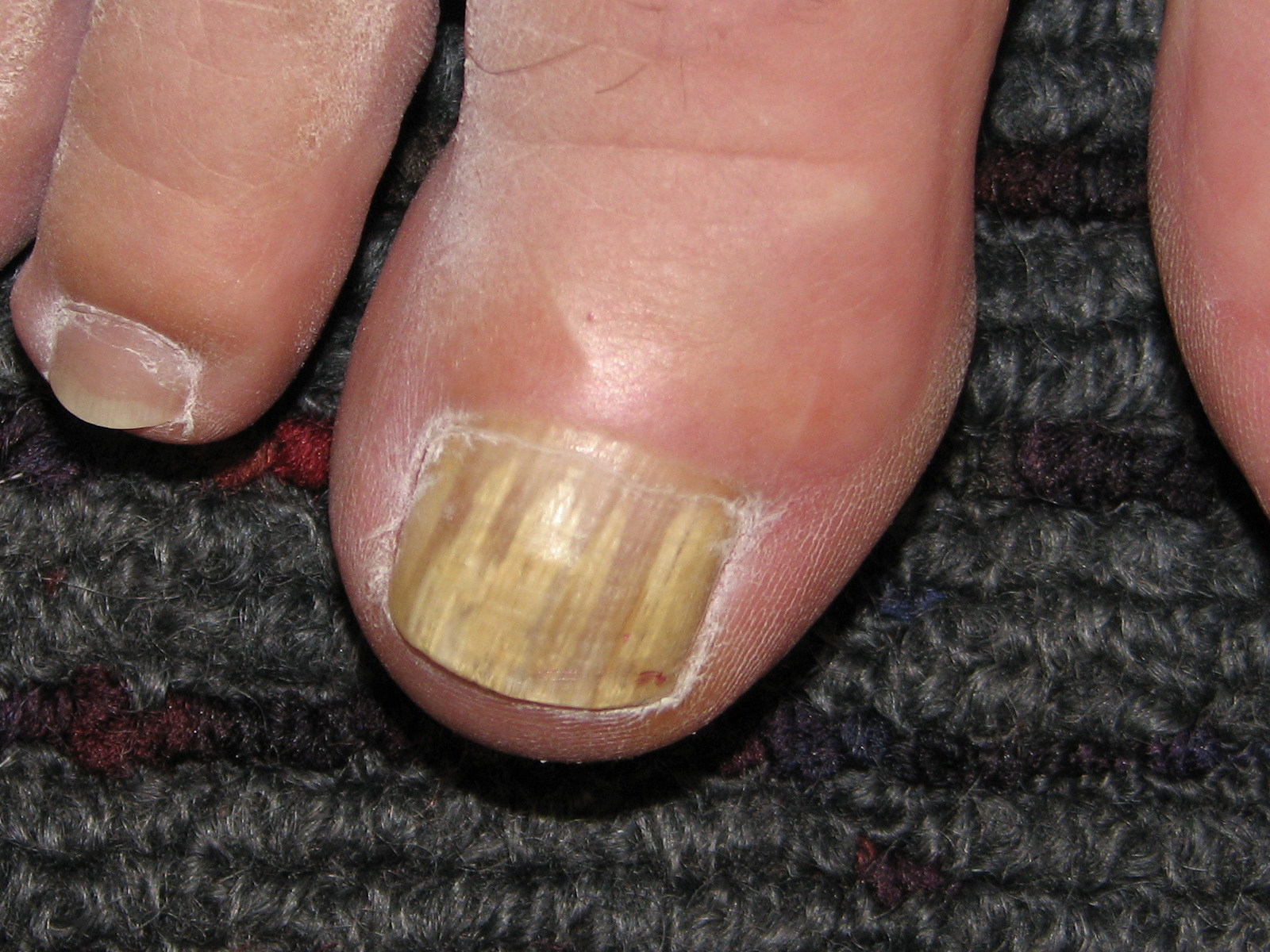 Forekommer hyppigere i tånegle end i fingernegle (ratio 9:1)