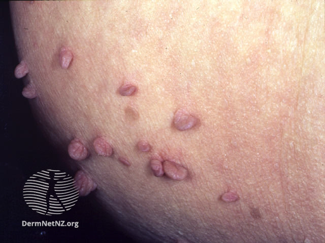 Lokaliseret i hudens folder: Axiller, øjenlåg, hals, lyske