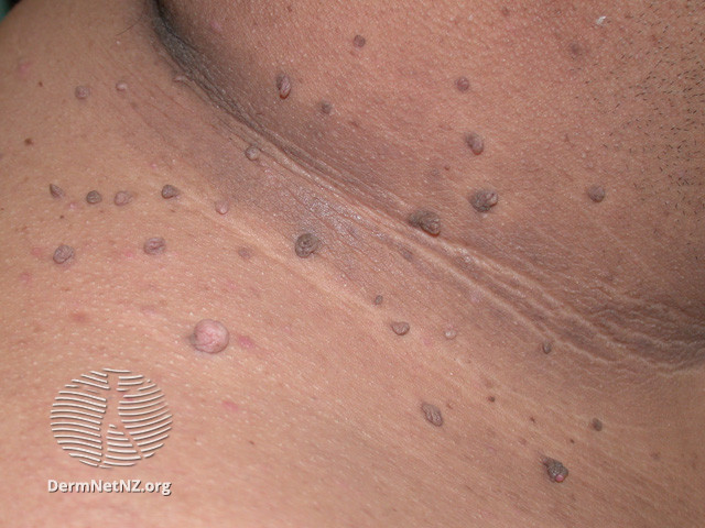 De hudfarvede til mørkebrune bløde tumorer, findes oftere i hudfolder hos overvægtige3