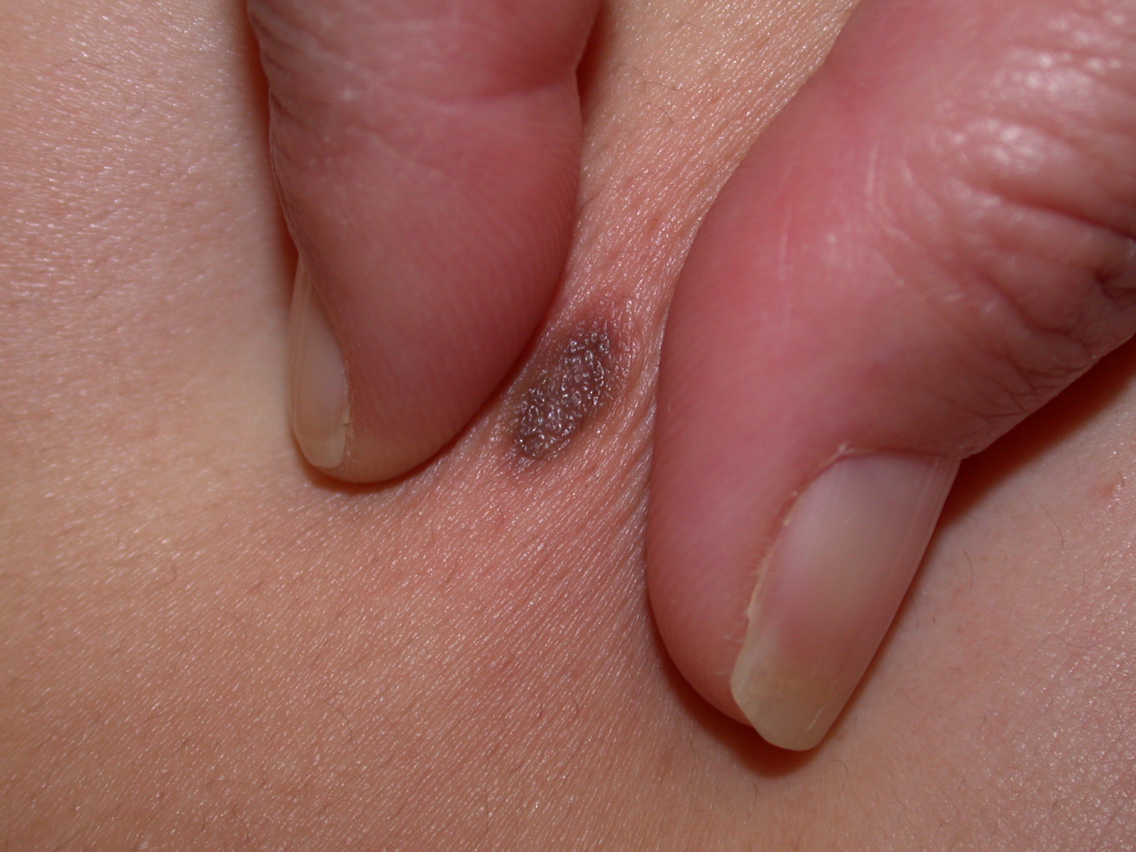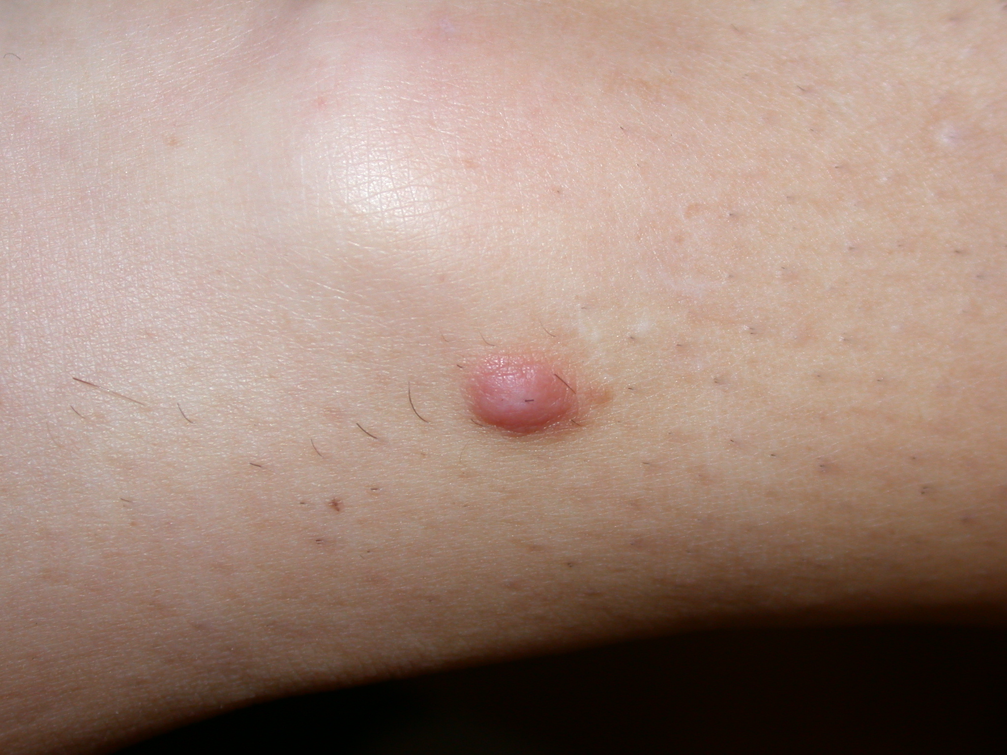 Dermatofibrom, her mere lyserødt, palperes som en fast tumor under hudens plan. Tumoroverfladen har et lysere centrum