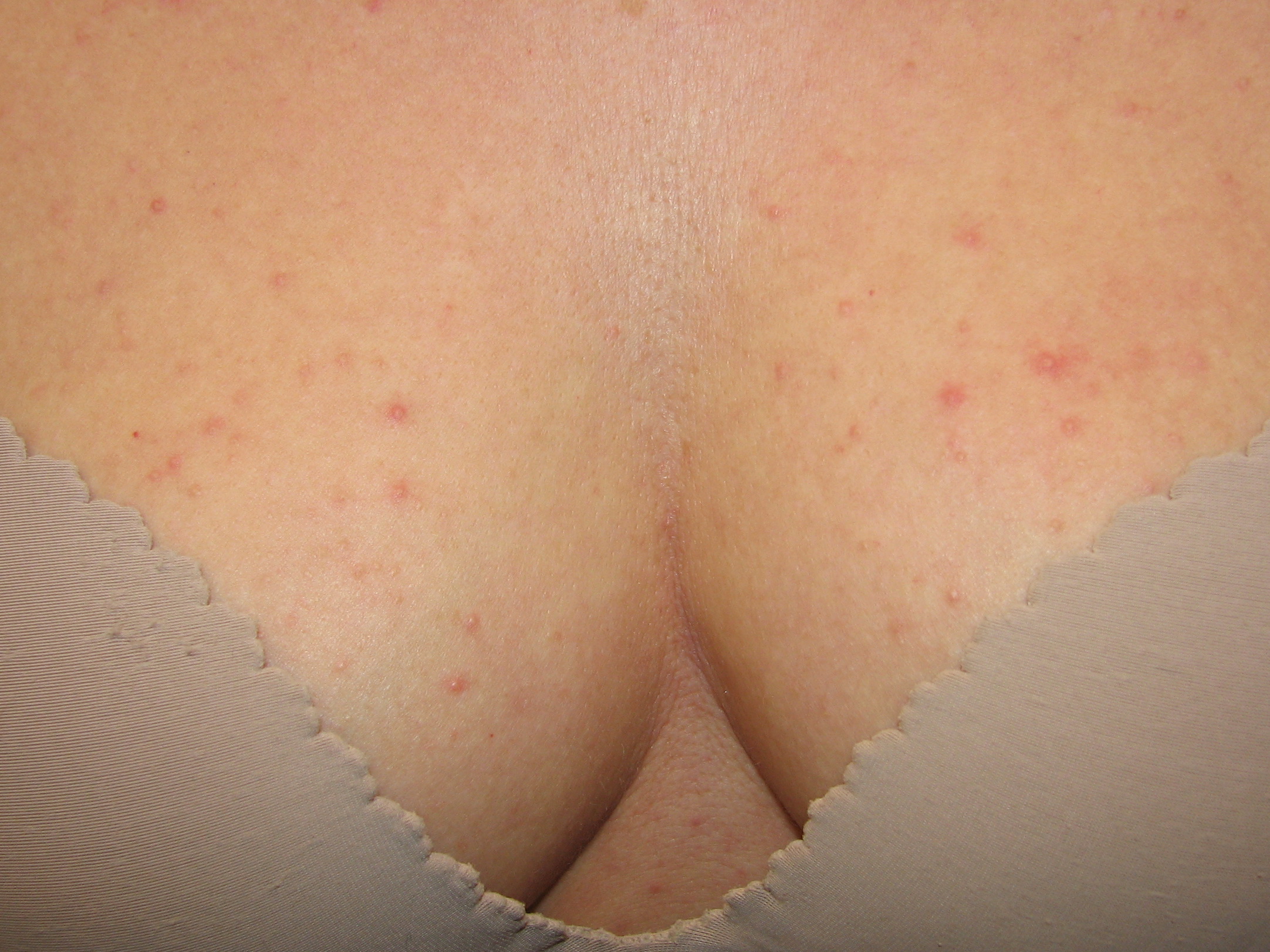 Ensartede små hvide pustler eller papler lokaliseret til bryst, nakke, ryg og overarme, ofte kløende