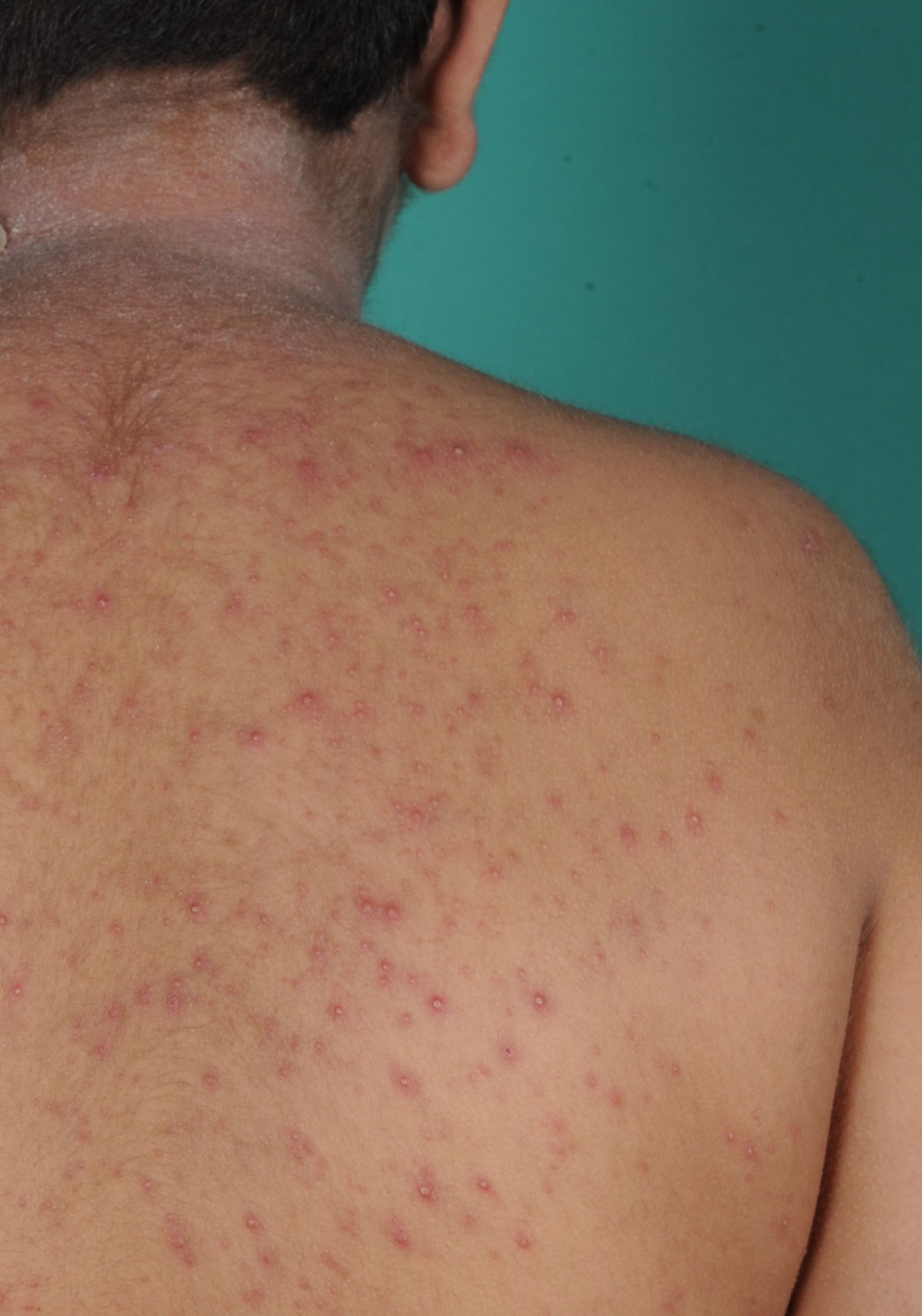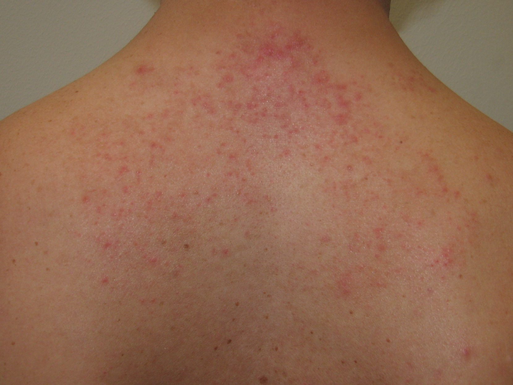 På ryggen, brystet, overarmene, nakken og i sjældnere tilfælde ansigtet ses et karakteristisk diffust udslæt af ensartede, 2-3 mm papuløse eller hvidlige pustuløse forandringer med perifollikulært erythem