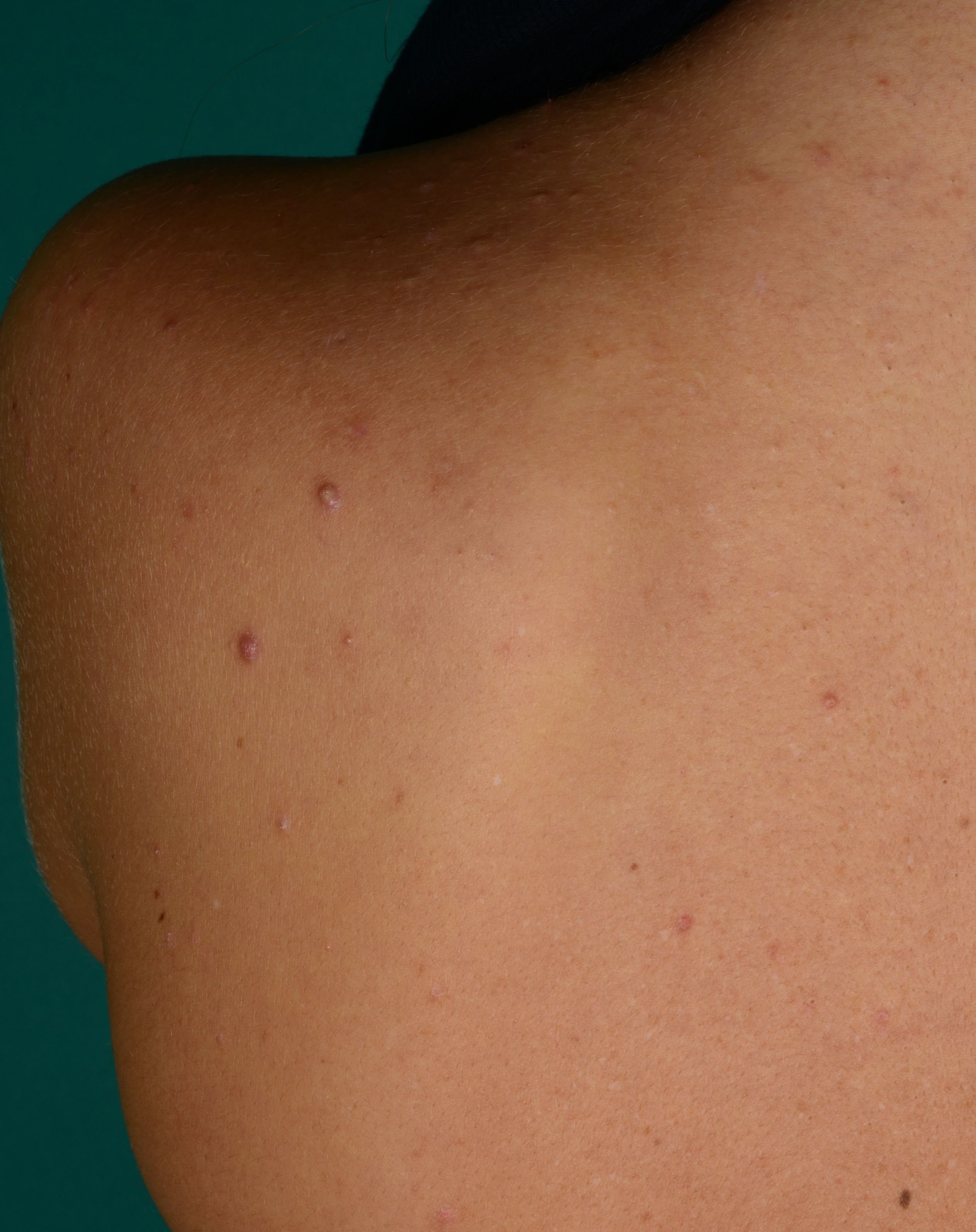 Kliniske billede med ensartede små hvide pustler eller papler lokaliseret til bryst, nakke, ryg og overarme
