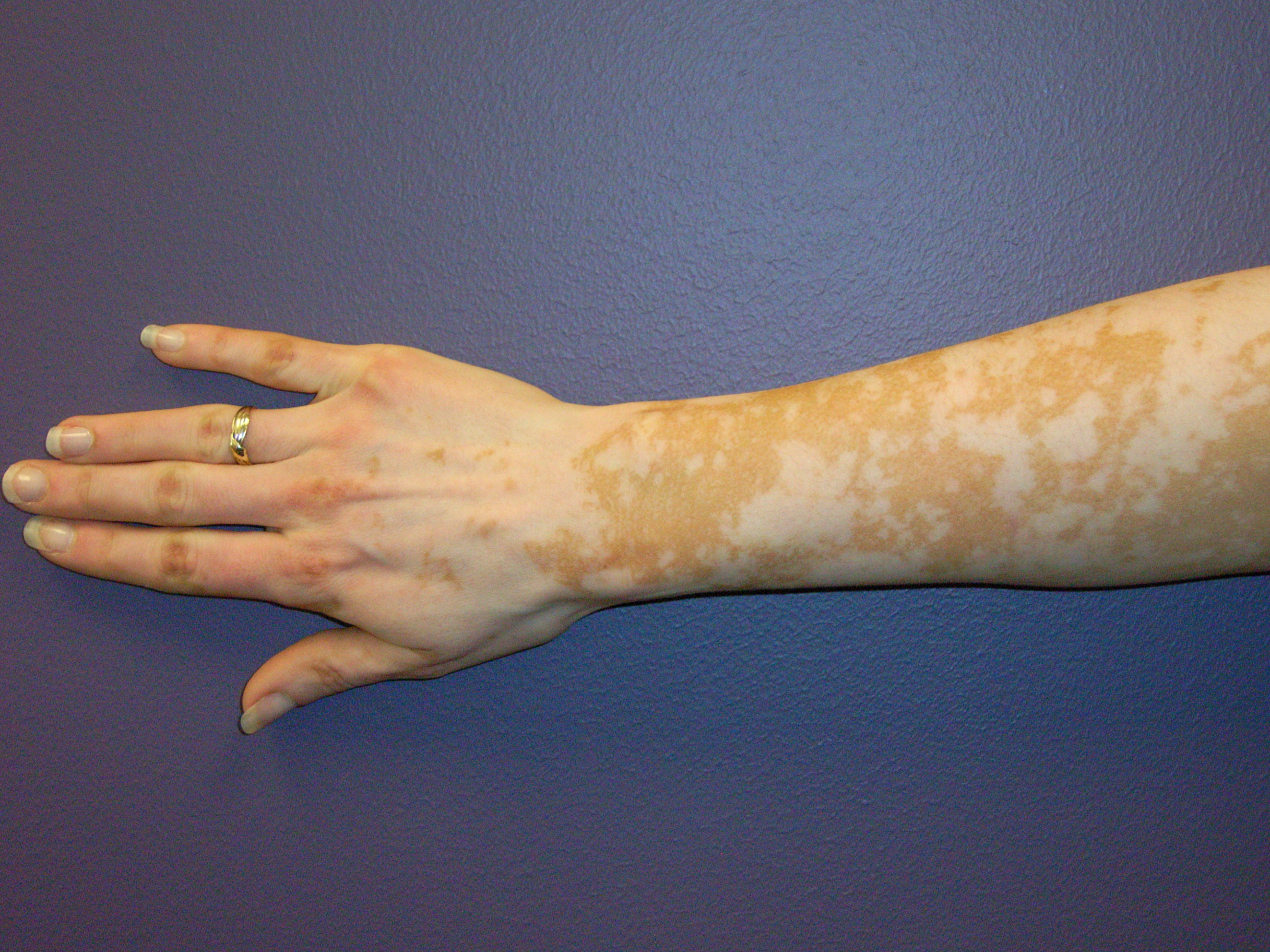 Vitiligo på arm. Pletterne ved vitiligo ligger i hudens niveau uden tegn til epidermale forandringer (ingen skældannelse).