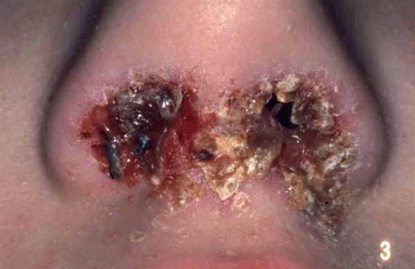 Læsionerne er ofte multiple, særligt rundt om næse og mund