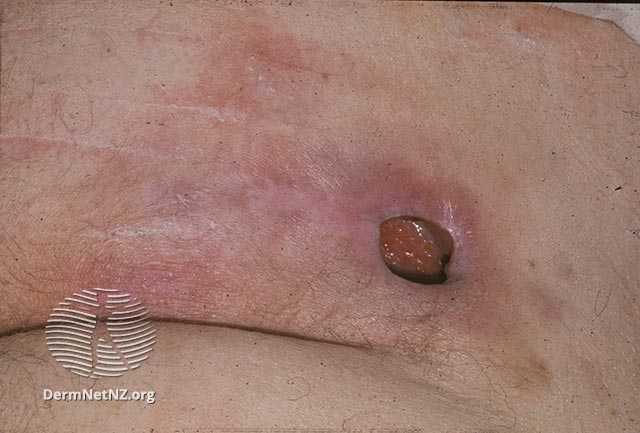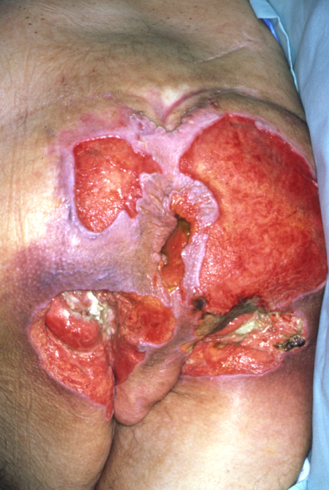 Kan præsentere sig som et vedvarende hyperæmisk, bulløs eller nekrotisk hudområde
