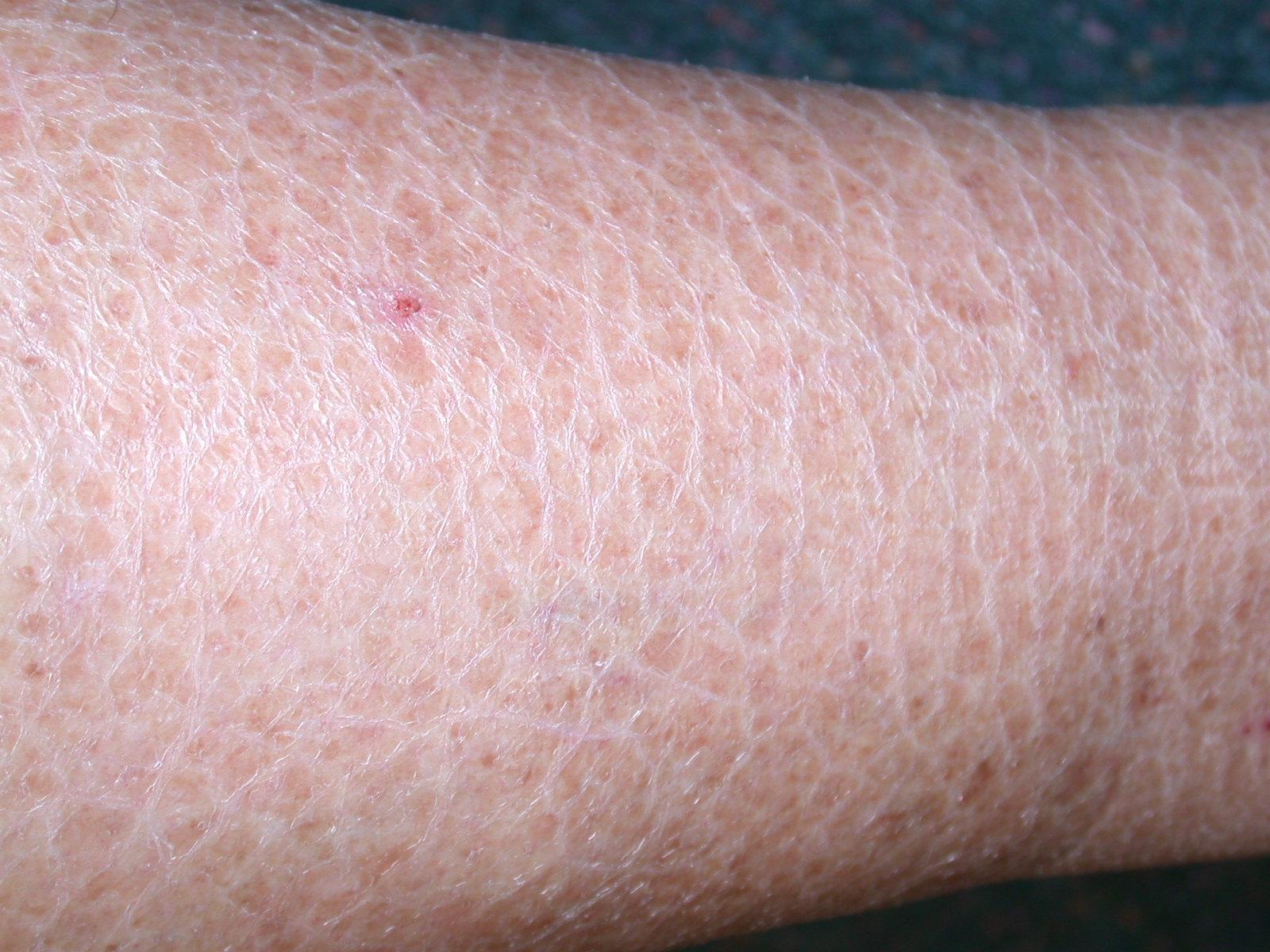 Klinisk ses tør skællende hud generaliseret til hele kroppen, og uden ledsagende erythem