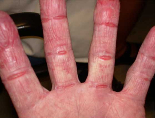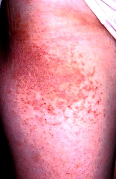 Hyppig lokalisation er hænder eller ansigt, men kan forekomme overalt på huden (opstår der hvor eksponeringen har været)