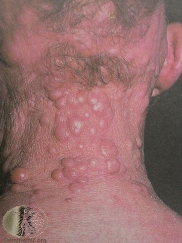 Mere fortykkede læsioner opstår efterhånden i flere regioner