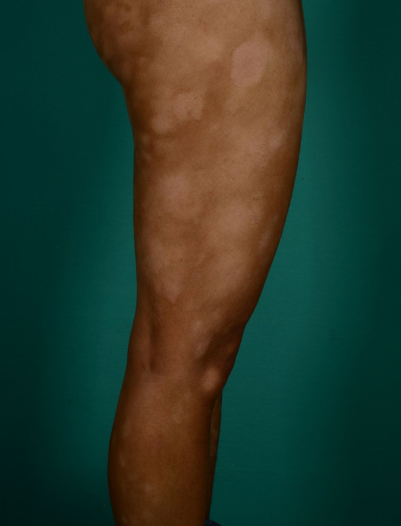 Ofte på ikke-soleksponerede hudområder som nedadtil på balderne, medialsiden af lårene og brystet