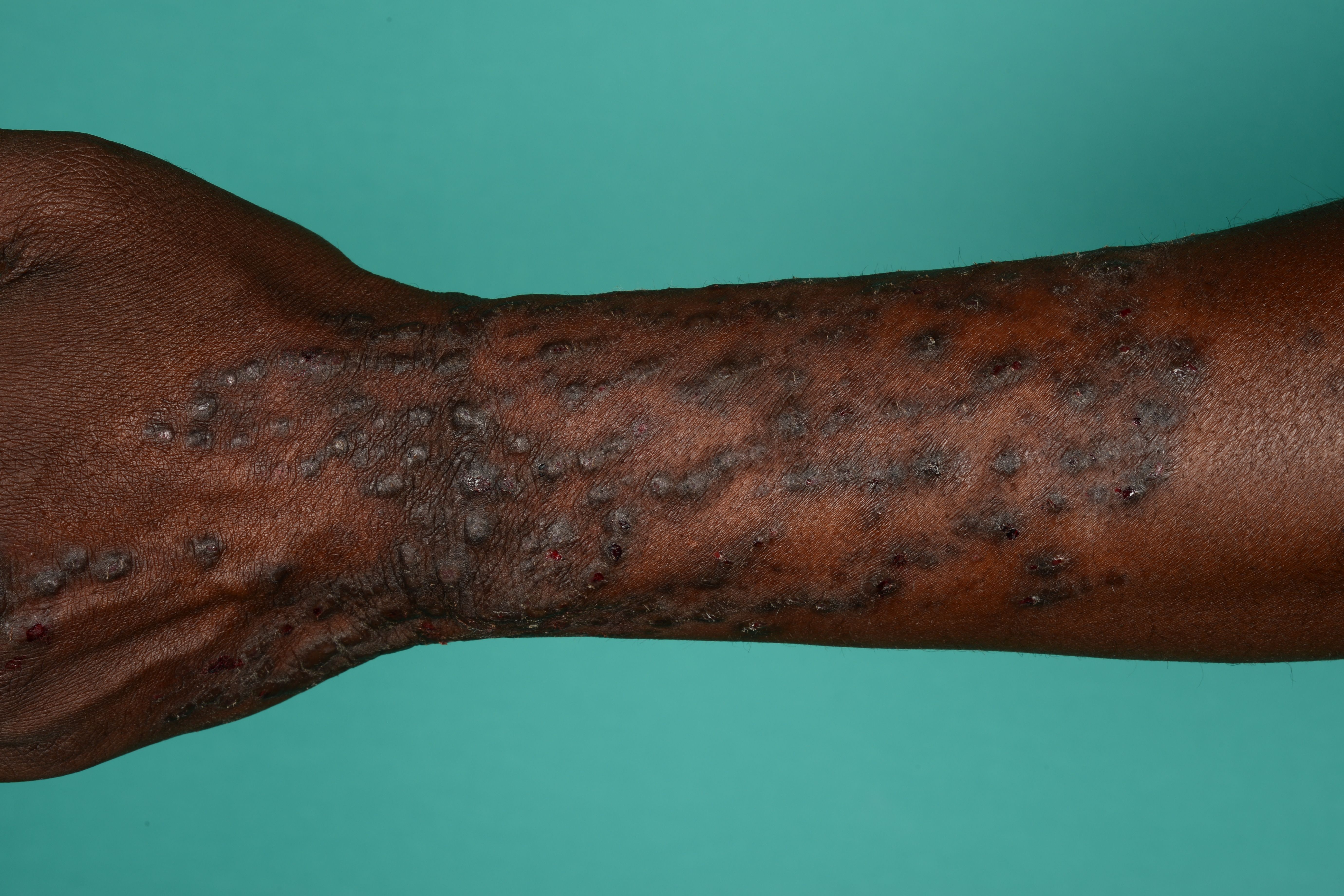Her ses multiple, mørke papler og fortykket hud på underarm ved lichen simplex chronicua/neurodermatit
