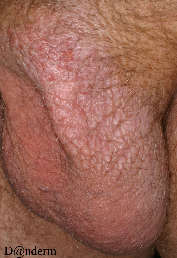 Et eksempel på fortykket og forkradset hud på pungen hos patient med lichen simplex chronicus. Foto venligst udlånt af Danderm