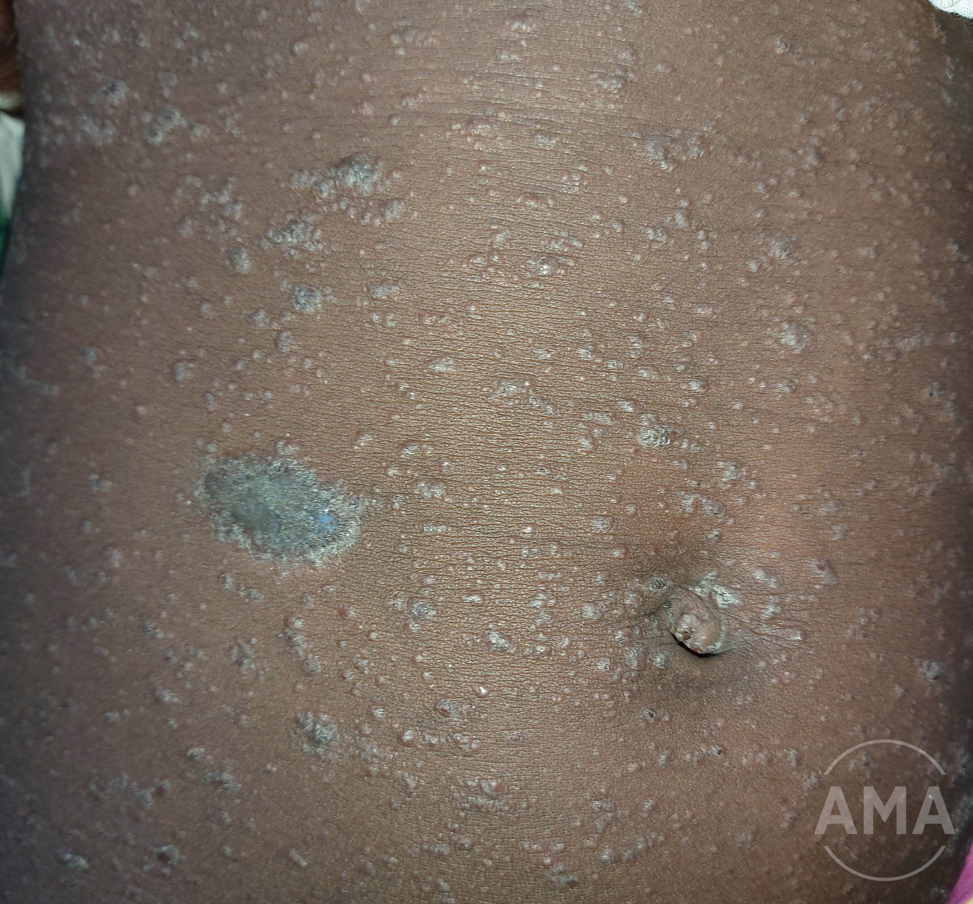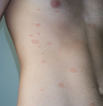 Udslættet er lokaliseret centralt, og findes på trunkus og proksimalt på ekstremiteterne (område som kan dækkes af kortærmet T-shirt)