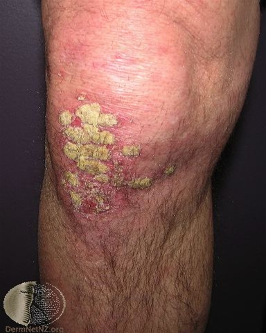 Foto af typiske gullige, skællende psoriasis plaques på knæ.Foto venligst udlånt af DermNet