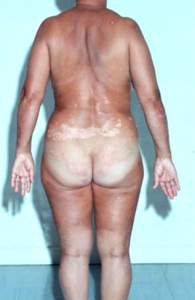 Patient med hypopigmentering på ryggen, der hvor der tidligere var psoriasis plaques. Pigmentet gendannes over uger.Foto venligst udlånt af DermNet