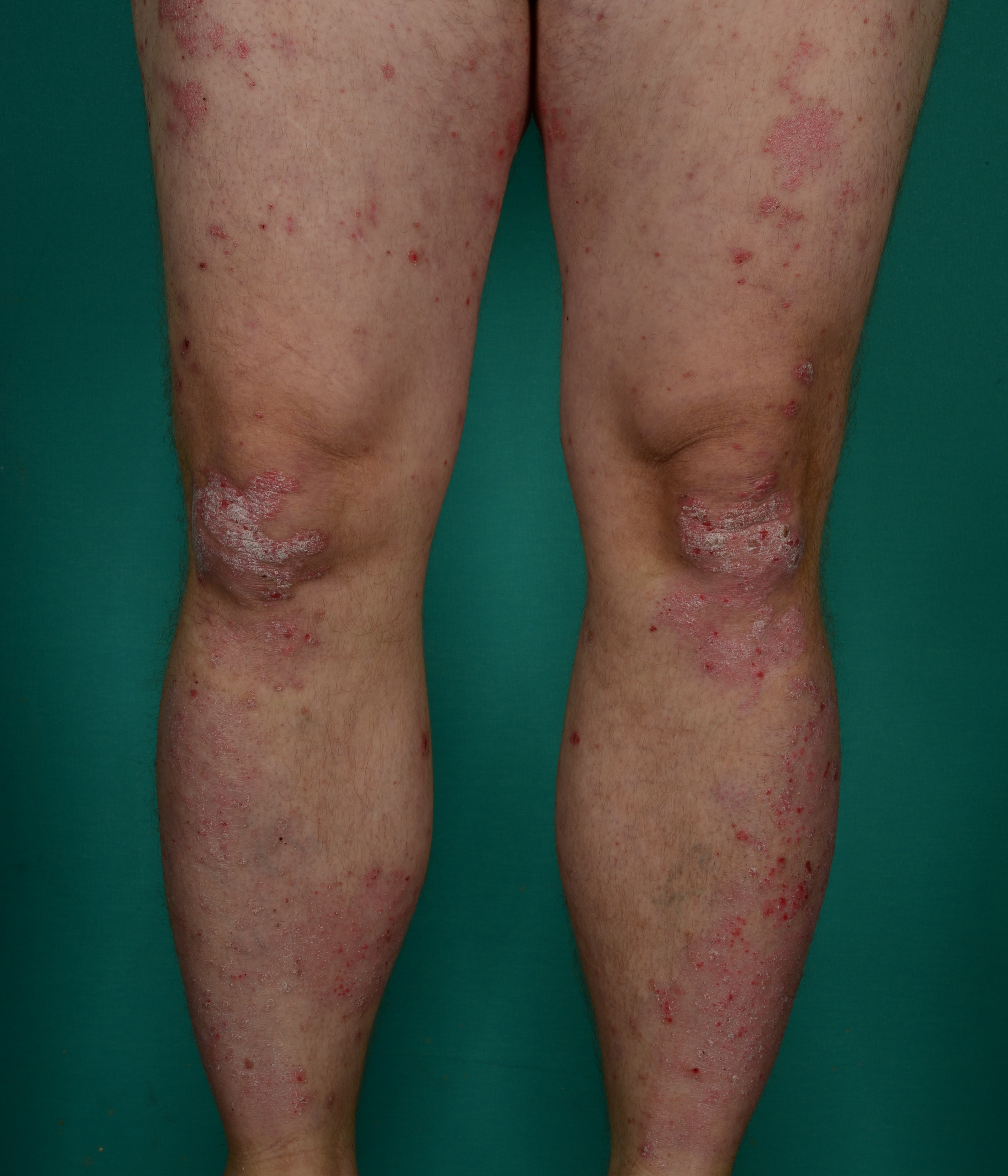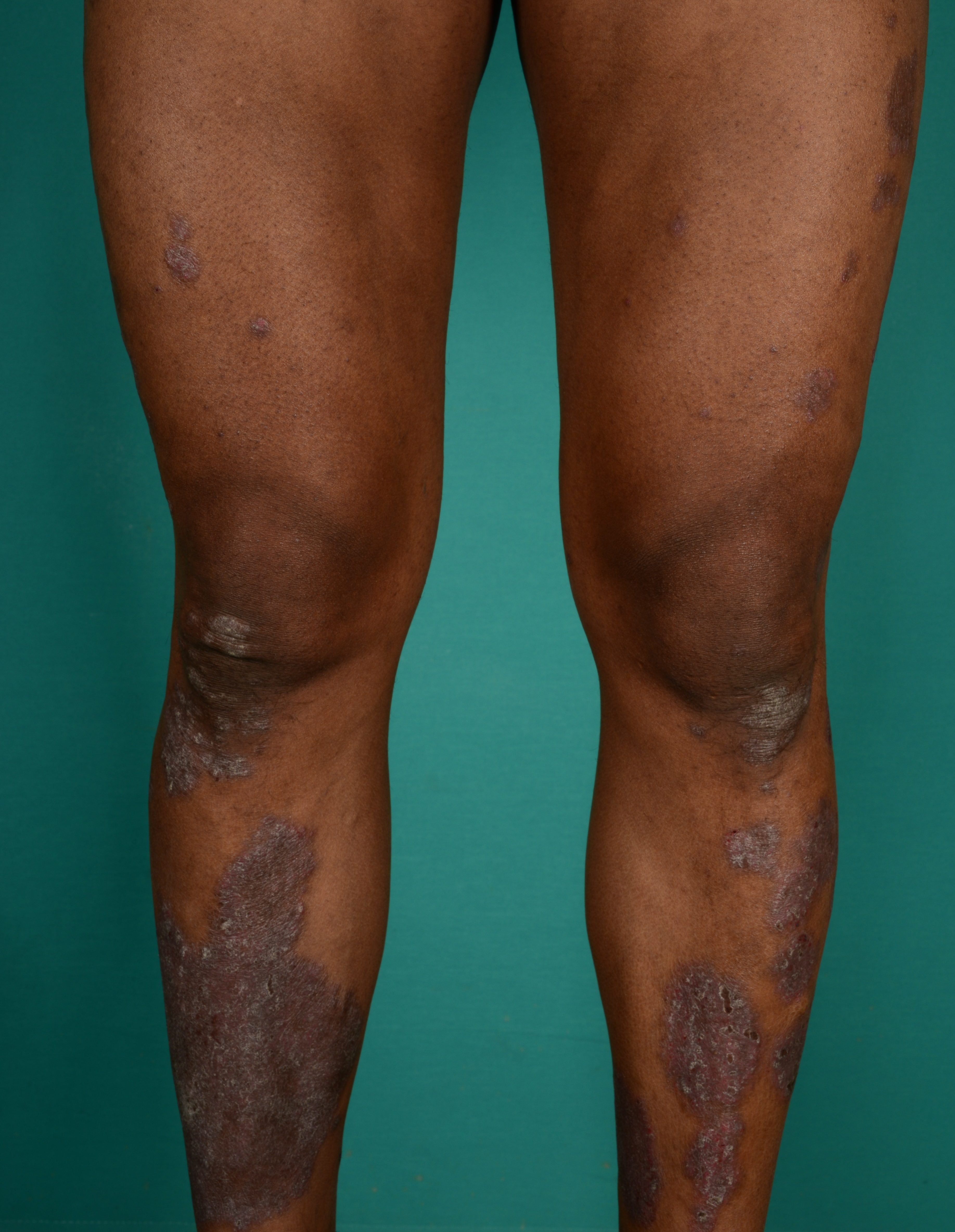 Her ses to patienter med psoriasis på benene, hhv pink og mere gråbrune velafgrænsede, hvidligt skællende forandringer på knæ og crura, såkaldte psoriasis plaques