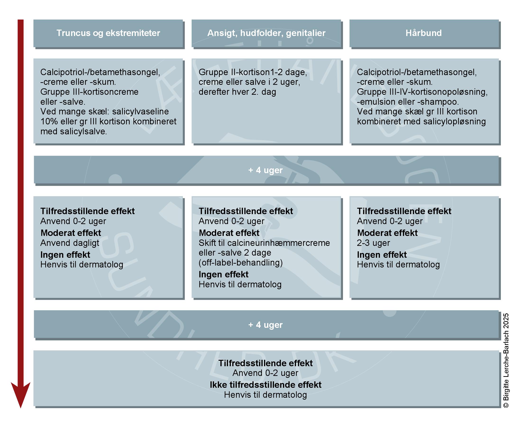 Det er en god ide at skifte til anden relevant evidensbaseret topikal behandling eller henvise patienten til dermatologisk speciallæge, hvis der ikke ses effekt efter 28 dages behandling