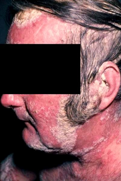 Foto af svær psoriasis i ansigtet, hårbund og øre.