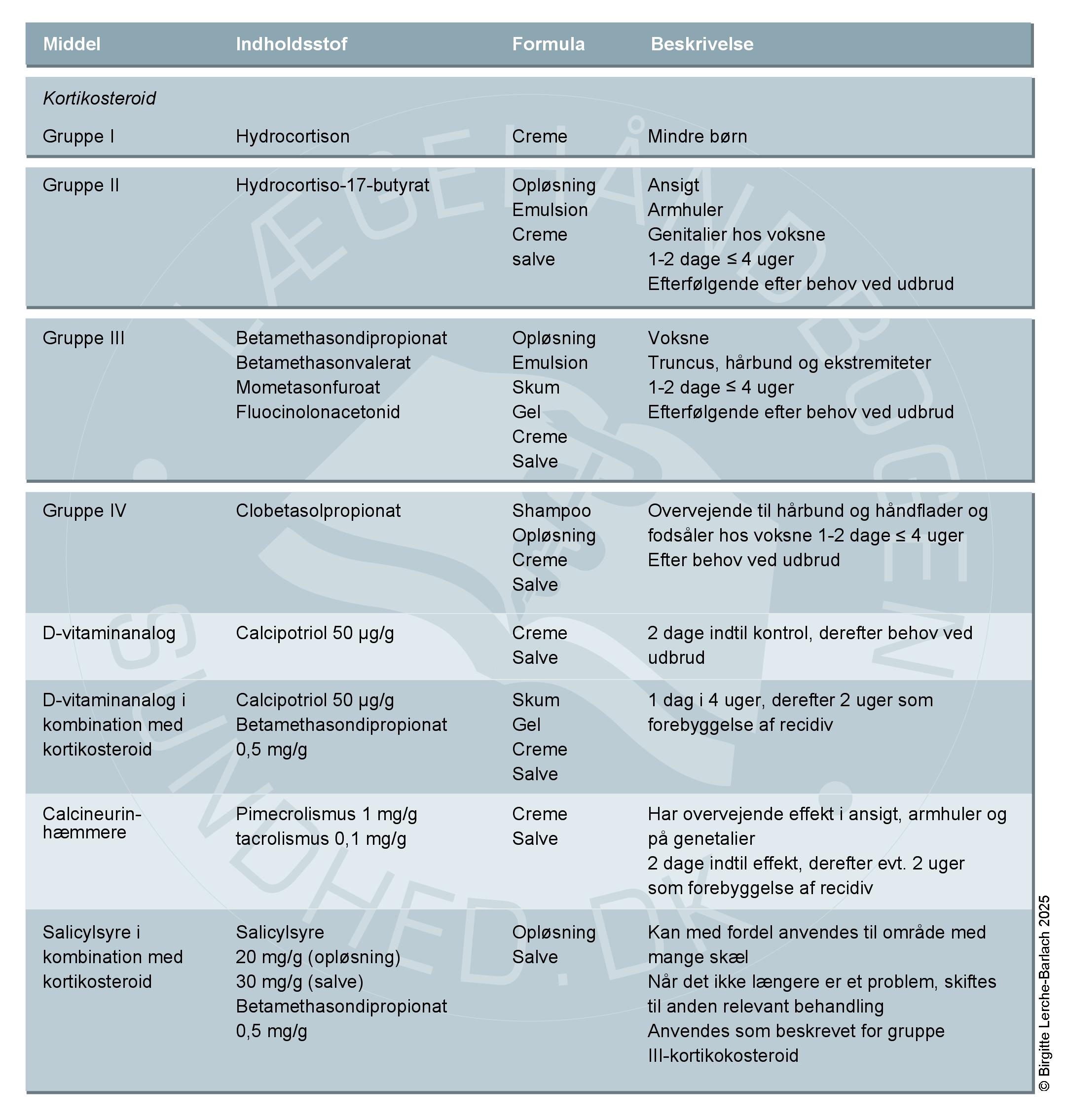Hovedparten af patienter med psoriasis har mild til moderat hudsygdom, som kan behandles med lokale lægemidler. Førstevalg steroidcremer evt kombineret med topikale D-vitamin analoger