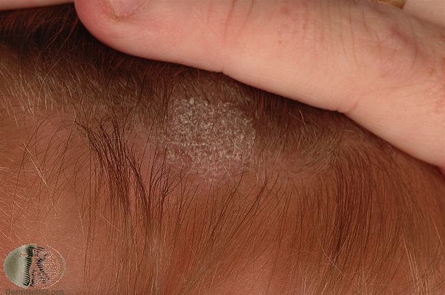Pletvist hårtab er typisk, med let rødme og skældannelse og knækkede hår