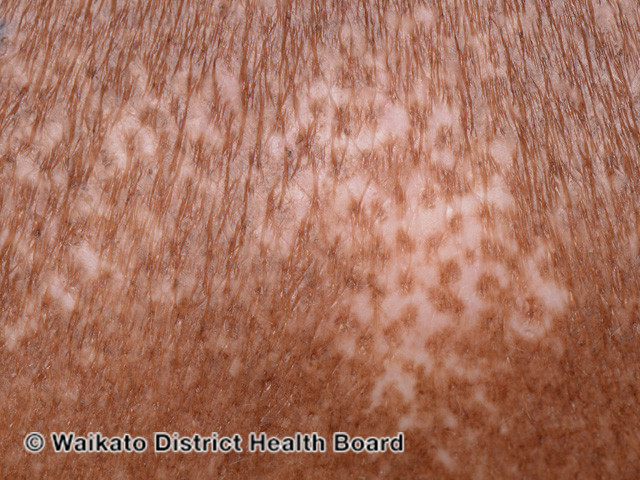 • Ofte ses hyperpigmenteringer, hårtab på den afficerede hud og kalkaflejringer i huden (kutane dystrofiske calcinoser) ofte på fingre og albuer