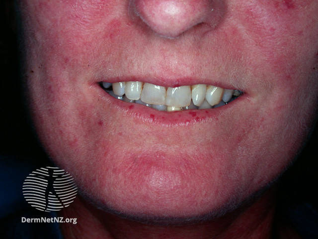 Systemisk sklerodermi giver atrofiske forandringer. Mikrostomi og radiær furing af og omkring munden. Foto venligst udlånt af DermNet