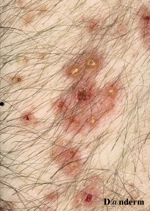 Udslættet forekommer ofte over skuldre, albuer, knæ og nates, samt et polymorft udslæt med små, grupperede papler eller vesikler, eventuelt bullae, der hurtig eroderer, crustae, og varierende grad af erytem