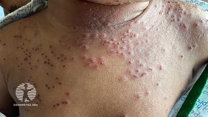 Eczema herpeticum på halsen hos et spædbarn.Foto venligst udlånt af DermNet