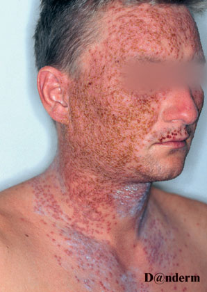 Udslættet er lokaliseret til ansigt, hals og trunkus