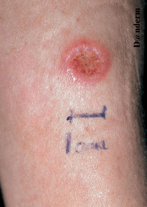 - Kutan leishmaniasis med indolent og langsomt progredierende sår med voldformede rande efter relevant udlandsrejse