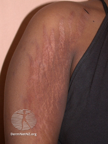 Foto af skulder med mange striae efter anvendelse af steroid-holdige blegecremer. Striae kan i visse tilfælde kosmetisk behandles med dyelaser